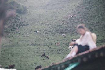坐在屋顶上,看着漫山, 牛羊在身后的山坡奔跑, 夕阳下落下照耀在头发上。