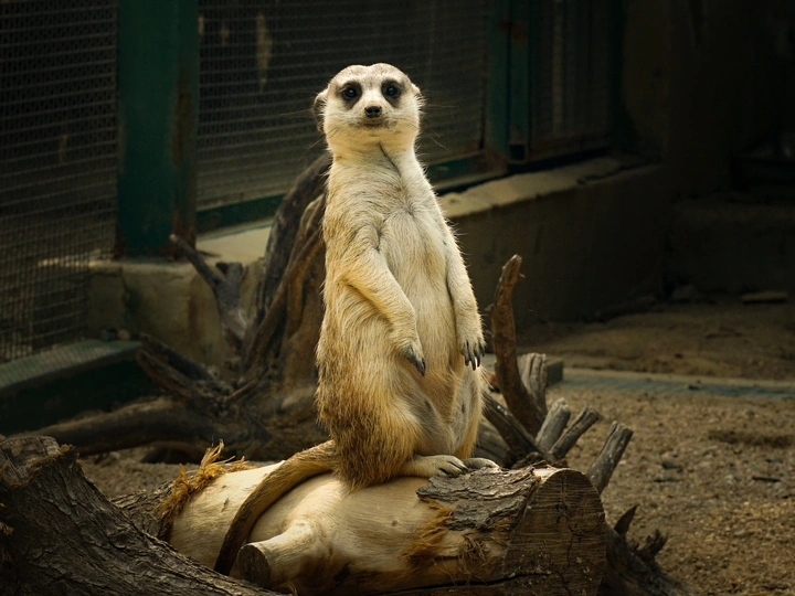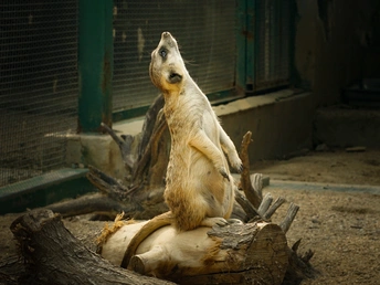 在郑州动物园里,生活着一群可爱的狐獴。它们有着小小的耳朵,大大的眼睛,还有那细长的爪子。有两只狐獴特别引人注目。一只狐獴站在木头上,直立着身子,眼睛睁得大大的,好奇地看着周围,仿佛在寻找着什么有趣的东西。另一只狐獴则仰着头,似乎在感受阳光的温暖,又像是在观察天空中飞过的小鸟。