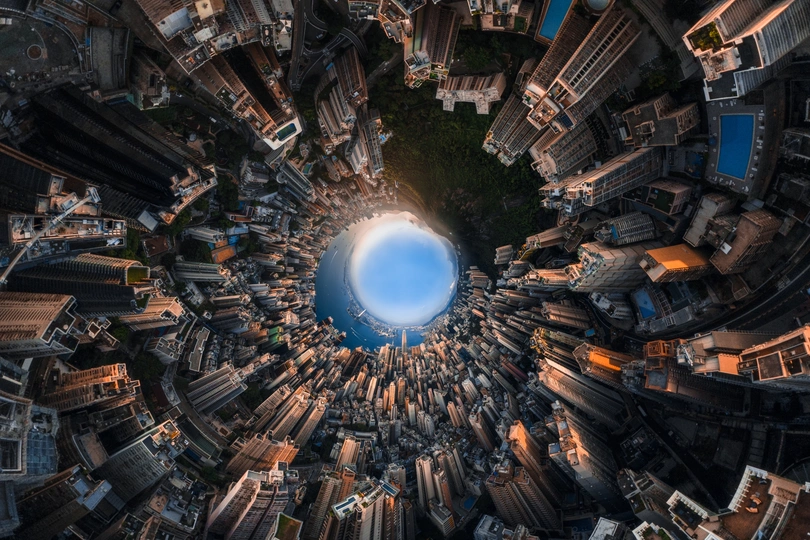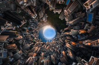 在香港维多利亚港日落的时候,夕阳给建筑渲染上光影效果。无人机在试拍的返航途中顺手按了一下球型全景功能,拍摄过程中镜头边旋转边停顿拍摄,前后两张的画面,不断重复在眼前刷过,认真观看的确会给我带来一种空间扭曲的错乱感觉,回到电脑上尝试一下与球型接片的反方向拼接,居然能还原这种夸张的视觉感受。