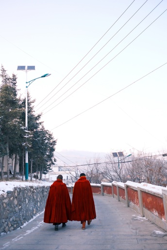 夏天的塔尔寺是赤诚的,冬天的塔尔寺是浪漫的。 白雪覆盖住金顶、绿瓦,还有一些顺着红墙落到地上。 一粒一粒的,捧一把挥洒到空中,又仿佛是在下一场为你而来的雪。