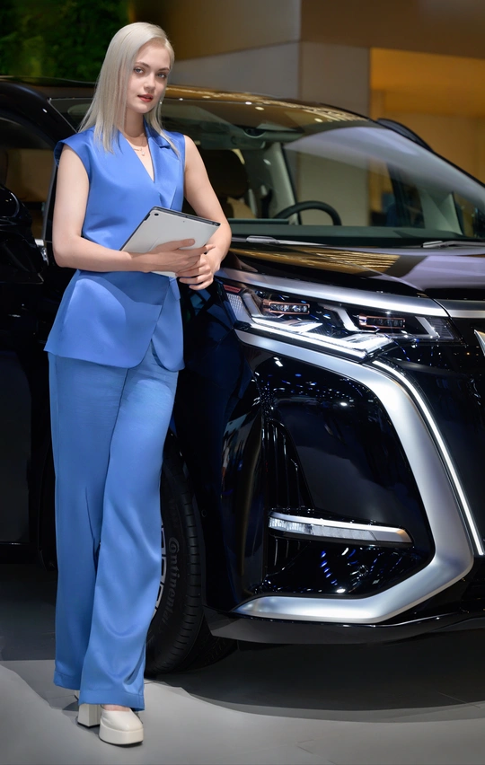 在璀璨的车灯下,她们是流动的艺术,每一步都散发着自信与魅力。她们的存在不仅仅是为了衬托车辆的美,更是将时尚与速度完美融合的展现。观众的目光随着她们的转身而转动,每一次微笑都如同一场视觉盛宴,让人难以忘怀。