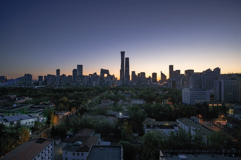 拍摄于早晨的北京,太阳从国贸背后升起,蓝调时刻天空变成紫色。