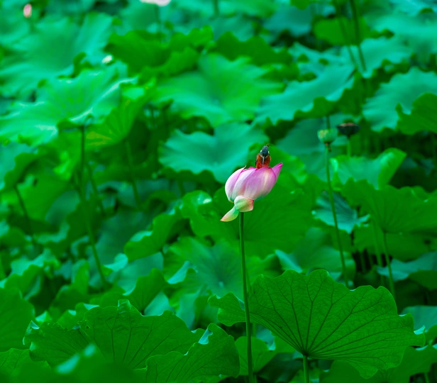 一只翠鸟藏在荷花的花朵里,突然,一只马蜂飞到翠鸟的头顶,企图蜇鸟儿,吓得鸟儿赶忙躲避。