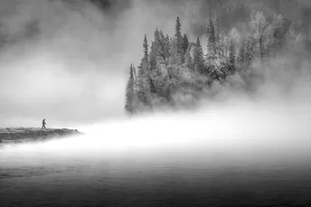 一种神秘的氛围,一个人独自漫步,给人一种孤独而静谧的感觉。