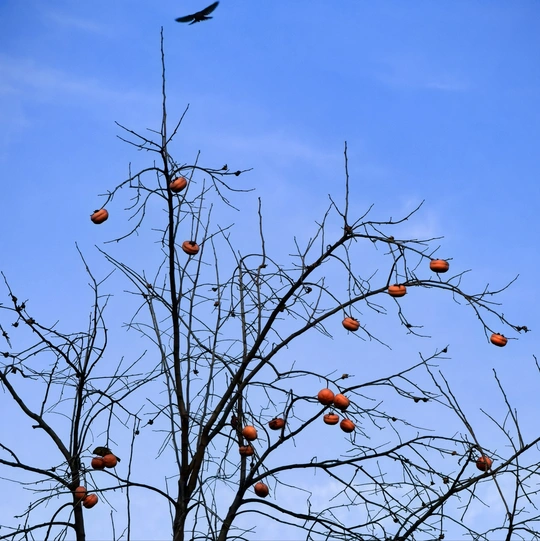 在五龙潭公园,低机位仰拍柿子树,恰巧一只鸟飞过,立即抓拍下来。