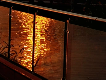 落日余晖照射在水面上,这种场景很有意境,但拍得多了总有些审美疲劳。正好看到洒在湖面上的光映射在旁边的玻璃围栏上,感觉别有一番新意!于是拍了下来