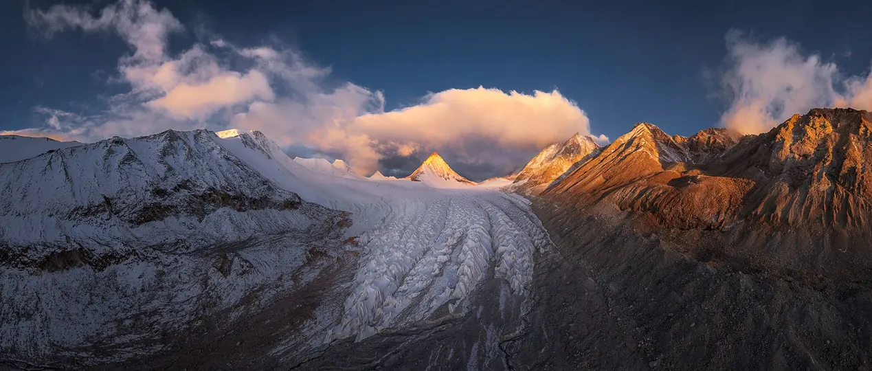 晨光点亮国王峰的冰雪与岩壁,金光铺展开大地的恢弘画卷,天空中流动的云彩为它增添一丝柔美。