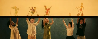 中国孩子带领其他国家小朋友一起表演皮影。是弘扬中国传统文化,也有带领中西文化的交流之意。