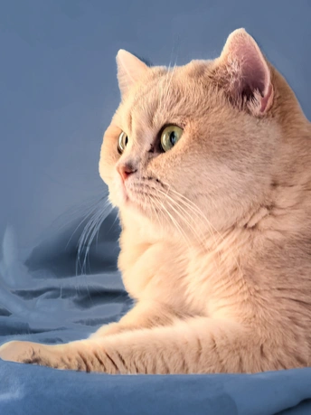 拍摄了午后家里窗前蓝背景前的一组金渐层猫咪,表现了猫咪的神态、毛发的质感和色彩对比。