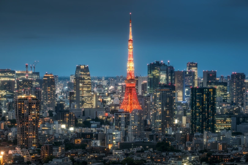 东京标志性的城市风光,红色的东京塔被周边建筑拥簇而立,星星点点的城市灯火璀璨闪耀,极具科幻感