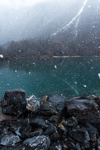 冬季,雪雨中的松坪沟百纳海,寒冷而宁静