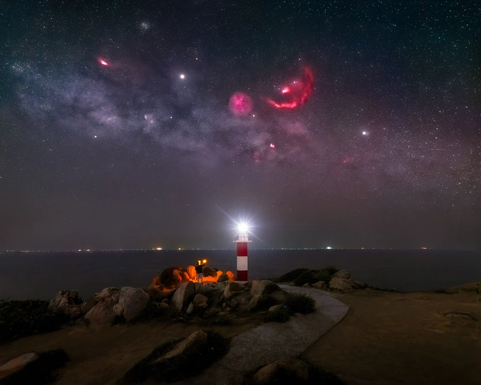 📍霞浦吕峡灯塔 冬季巴纳德环从东边悄然升起。 天空赤道仪跟踪拍摄两千七百多秒 📸:佳能6d天文改机