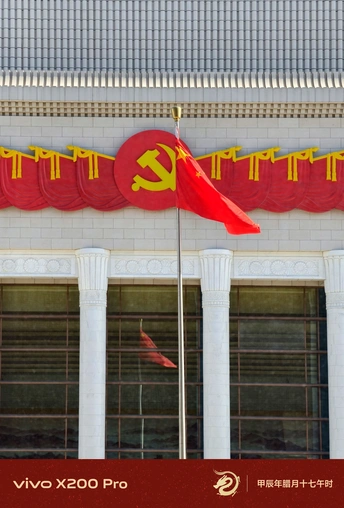 春节前的晴天,阳光下国旗与党徽相呼应。