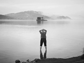 一老妪在江边洗头,一边欣赏着这雾气氤氲的江面。