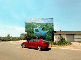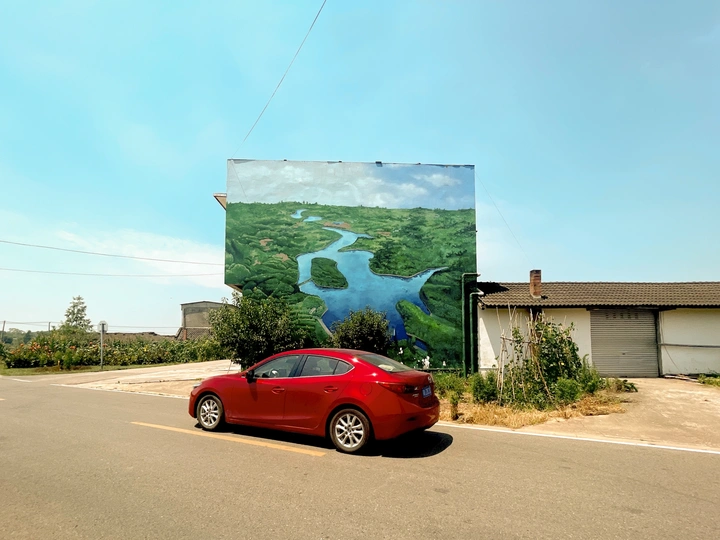 在旅途中走进一个村子,这里的河流被画在墙上,红色的汽车经过这条河流驶向远方。 📱 iPhone