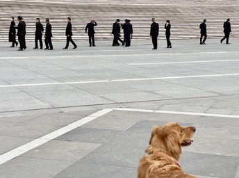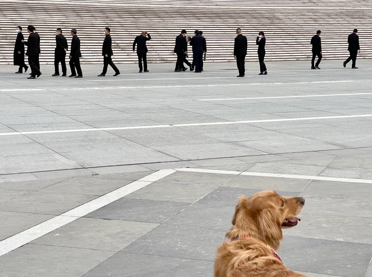 一只宠物狗好奇的望打望着远处的黑衣人群。 📱iPhone