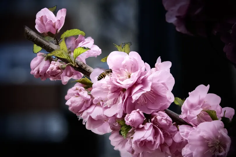 桃花簇簇映春光,粉面娇柔绽艳芳。 千朵万朵压枝低,似云如霞韵悠长。 蜜蜂翩翩舞花间,忙碌身影映暖阳。 轻盈振翅寻甜蜜,穿梭花海为谁忙。
