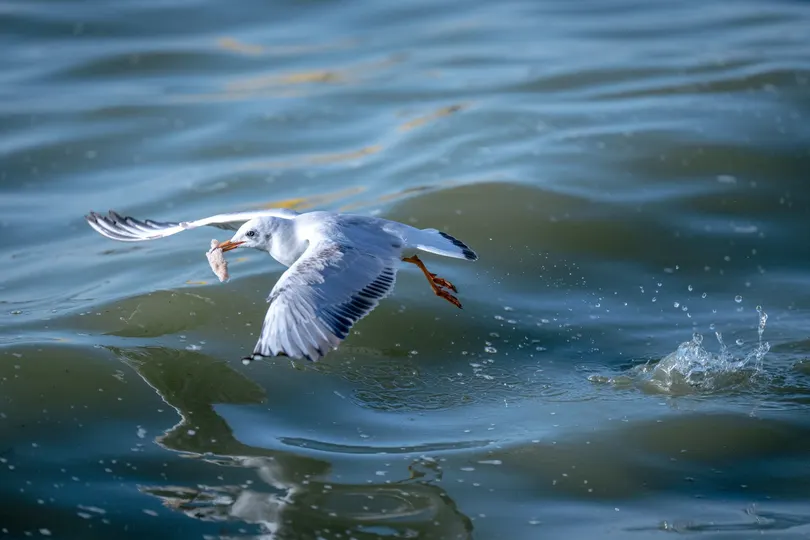 在滇池边闲逛的途中,游客们纷纷将自己手中的面包屑撒向鸥群,突然,看到一只红嘴鸥从空中俯冲下来,准确地捕捉到了水面上的面包屑。我迅速调整相机设置,捕捉到了这个瞬间。这张照片不仅记录了红嘴鸥的优雅姿态,也捕捉到了它与人类世界的互动,是对自然之美的一次深刻捕捉。