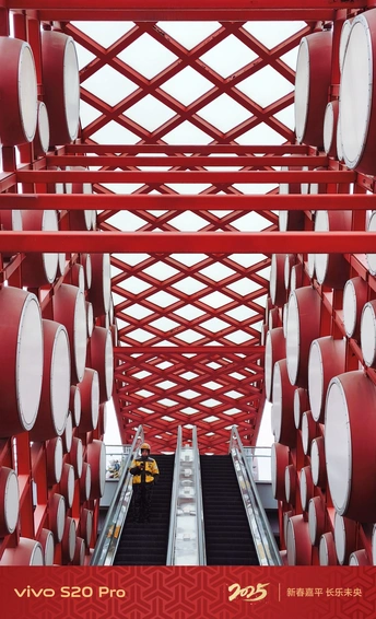 在北京奥林匹克公园的一处鼓墙前,红色的鼓鲜艳夺目。一位外卖员站在自动扶梯上,他身着的黄色衣服与红色鼓面形成鲜明对比。 ♦ SHOT ON VIVO S20 PRO