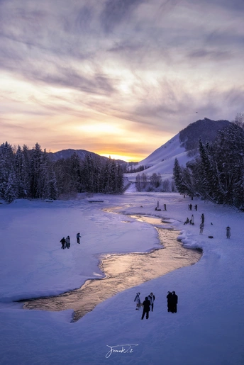禾木的冬夜即将来临。夕阳的余晖洒在雪山之巅,将天空染成温暖的橙红色,而河面上的冰层则反射出点点金光。