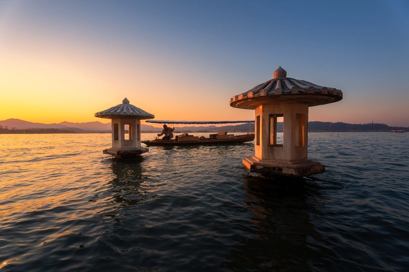在间隔拍摄的时候,船夫刚好在晚霞时刻经过翠光亭。相机刚好抓拍到船夫在翠光亭中间。