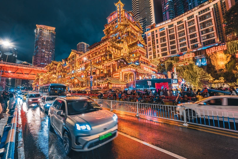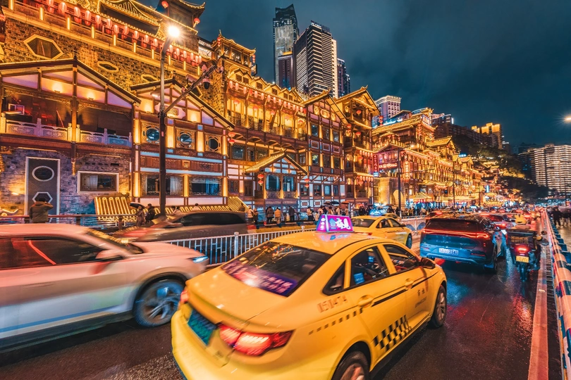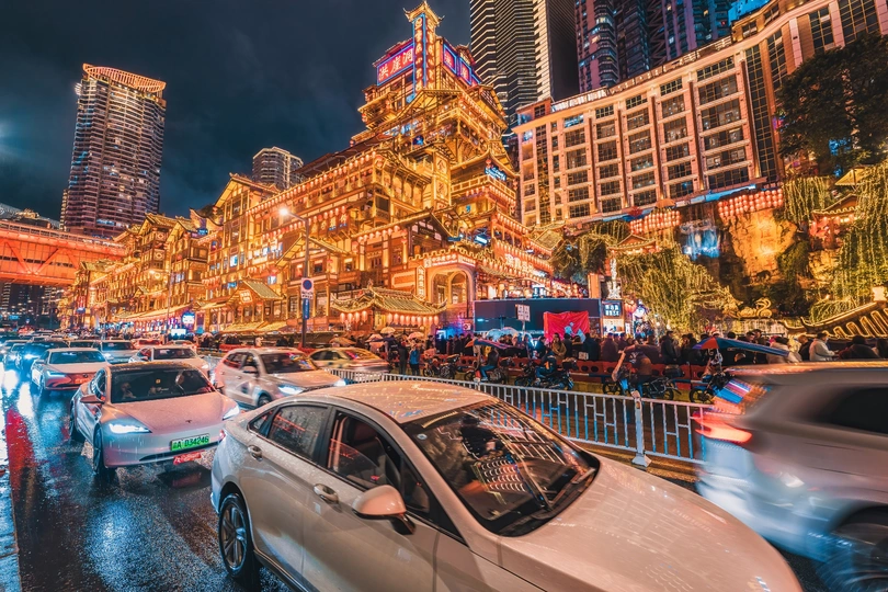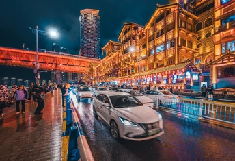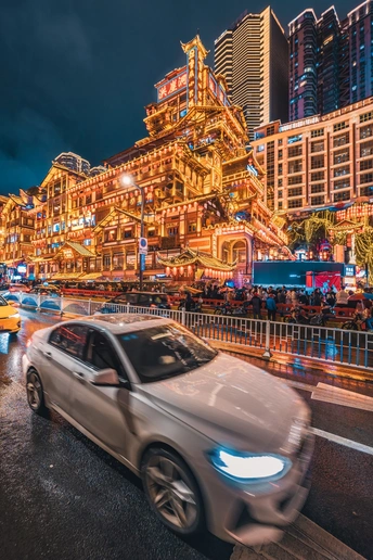 2025年1月25日,天虽然下着蒙蒙细雨,但是也没有阻挡游客前往重庆洪崖洞打卡的心。照片组图拍摄影重庆洪崖洞,晚上八九点,依旧灯火通明,车来车往,人来人往,游客打卡拍照乐此不疲,商拍的摄影师卖力叫卖着。