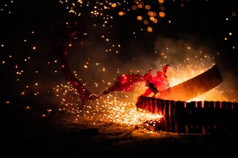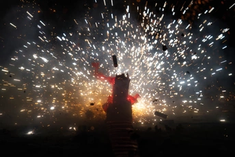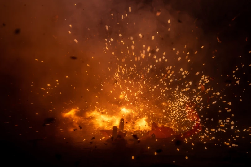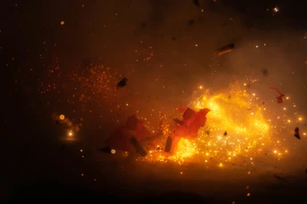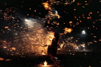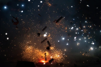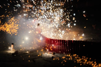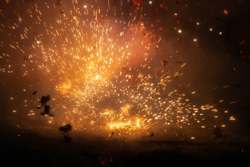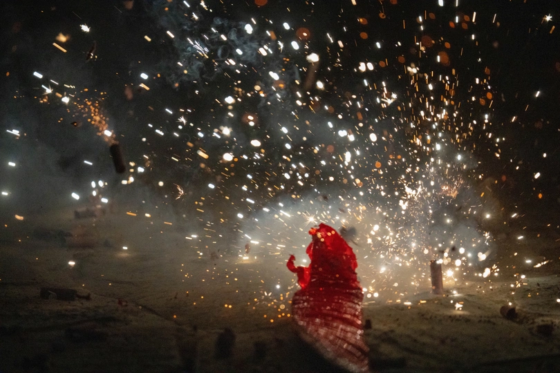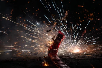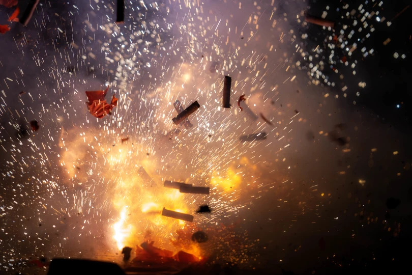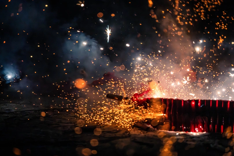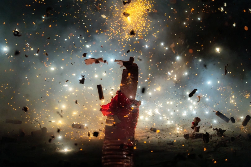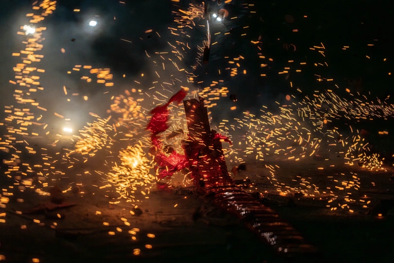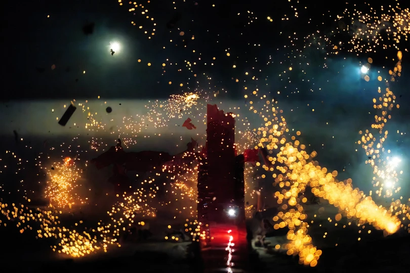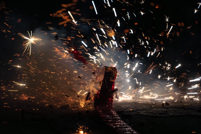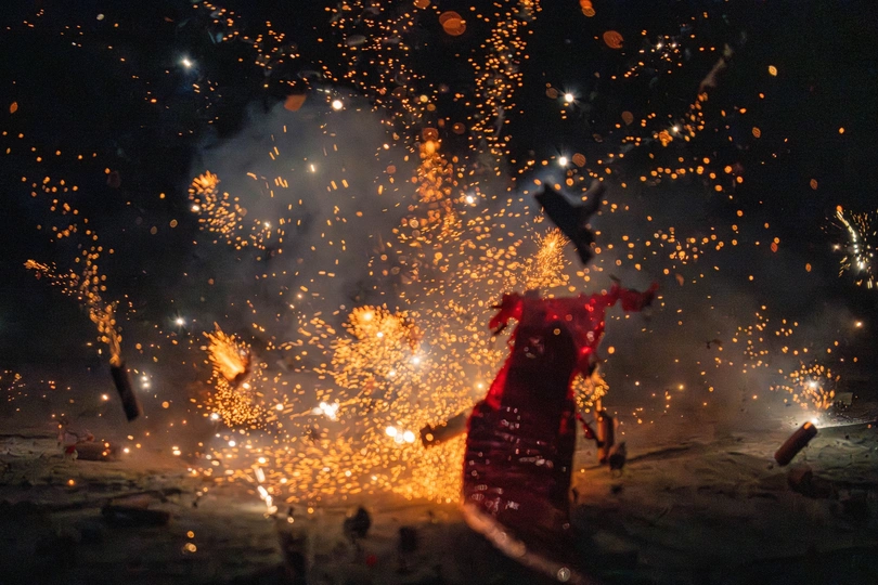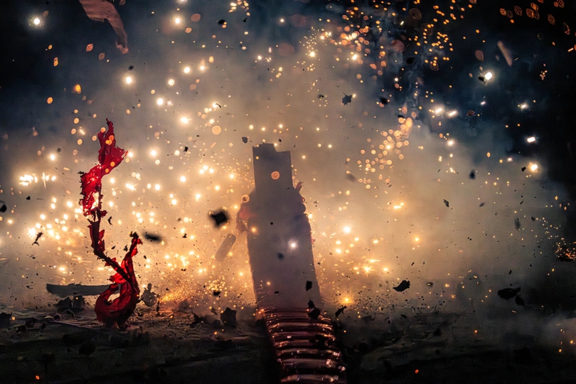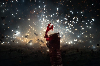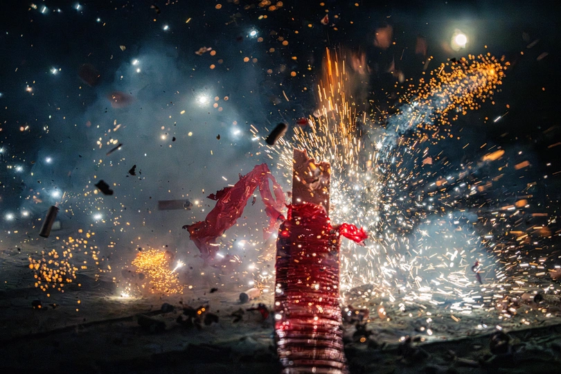 引线撕开黑夜,火星溅出竖琴弦,火药刺穿红纸,铁砂穿透烟墙。超长焦镜头下的鞭炮特写。