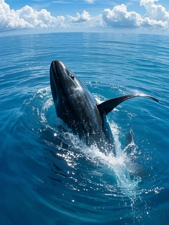 海洋深处,一个神秘而广袤的世界。座头鲸悠然穿梭,当它破水而出,庞大身躯在阳光下闪耀。周围,波光粼粼的海面与远处的蓝天白云相连。这里,每一道水波都藏着故事,每一次鲸鱼的呼吸都是与自然的对话。深海的寂静与鲸鱼的灵动形成奇妙对比,仿佛在无声诉说着地球生命的奇迹与大自然的无尽奥秘。