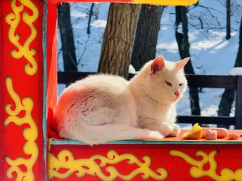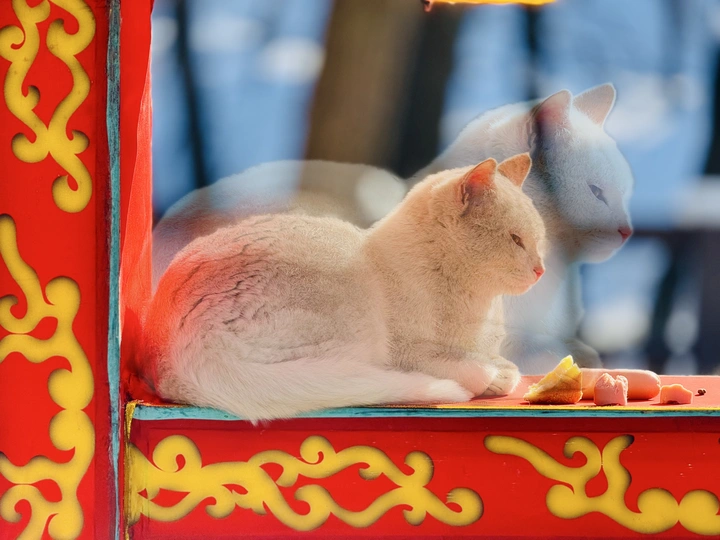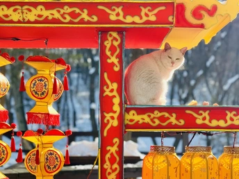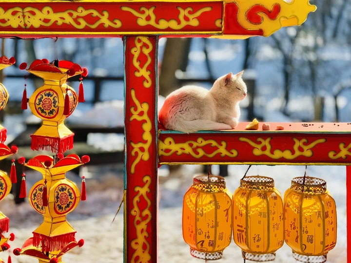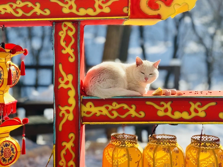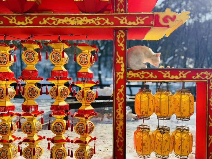 千山新春灯会,一只可爱的千山喵与彩灯相映生辉。