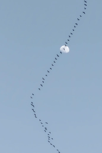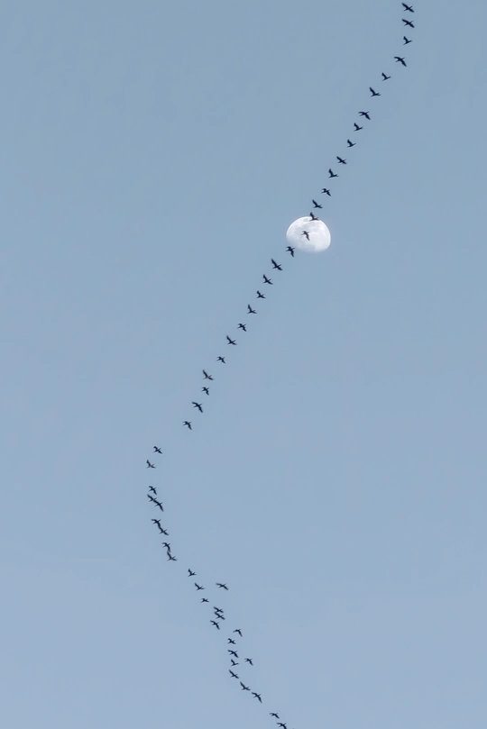 晴朗的天空,一群大雁结队掠过,留下人字形队影。明月如挂,静静地陪伴它们的旅程。