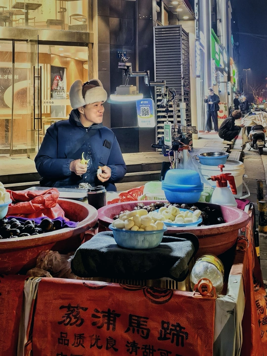 元霄过后,乍暖还寒时候,夜幕下,一位自信满满的小伙子,在三轮车搭建的马蹄货摊前,边削着马蹄,边与顾客调侃地说着手中的马蹄,似乎完全不愁销路。