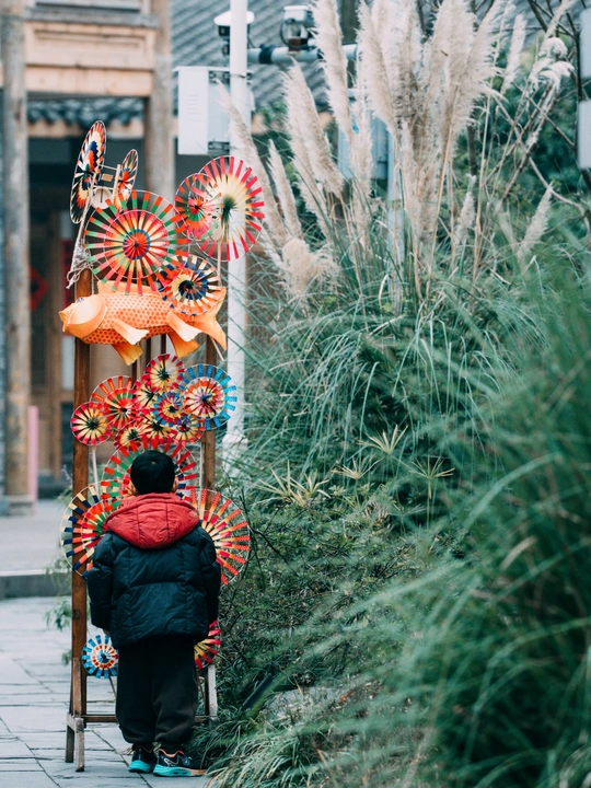 被风车吸引的小孩