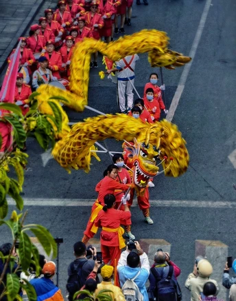 金黄的舞龙在人群间灵动穿梭,舞者们配合默契,动作娴熟,将龙的神韵展现得淋漓尽致。周围观众纷纷举起相机、手机记录,气氛热烈非凡,生动呈现出传统民俗活动的魅力与活力。
