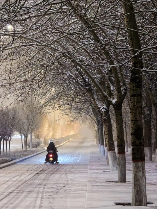 在寂静的冬夜,雪花轻柔地覆盖了大地,归途中的身影在灯光下显得格外温暖。无论前方的路有多漫长,家的方向总是最温暖的港湾。