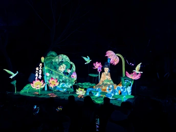 在元宵节的蓝调时间,在趵突泉拍摄了大型花灯《如梦令》,表现了花灯的精美和李清照诗词中的场景。