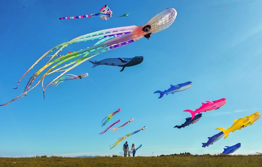 湛蓝的天空中飞舞着满天的风筝,孩子在父母的关怀中感受着温暖的童年。