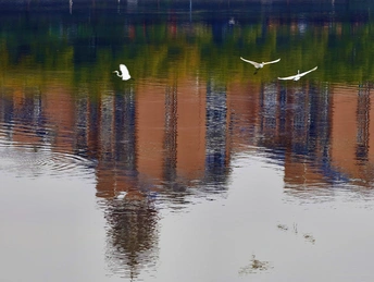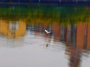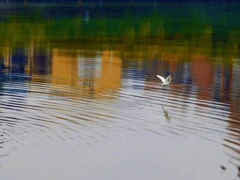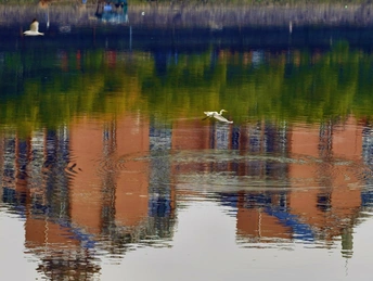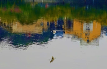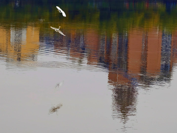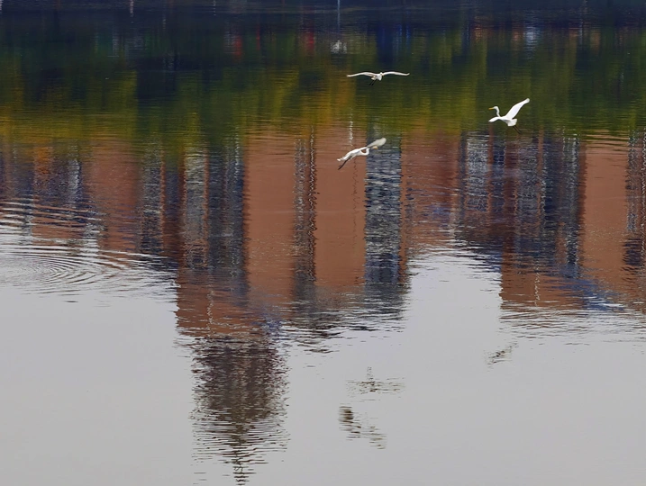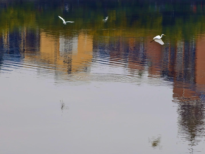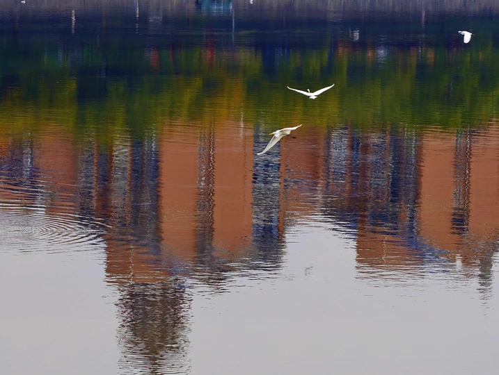 濛濛细雨的冬天,三三两两的白鹭在彩色倒影的海面上自由的飞翔,这画面像幅水彩画。