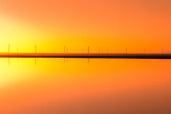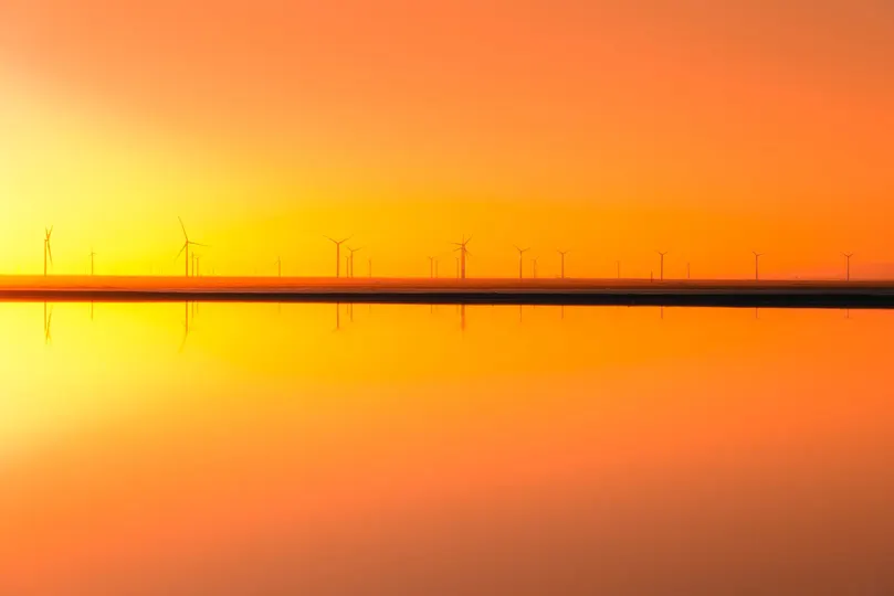 冬天的湖泊是宁静的,尤其清晨,如同镜面一般的湖泊让人几乎无法天与地,在茶卡盐湖的岸边,风力电机一排排陈列开来,朝霞映红天空与湖泊,形成无法区分二者的镜面效果。