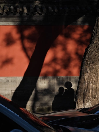 母子俩记录着生活的美好,光影则在墙上留下这一刻美好的景象。