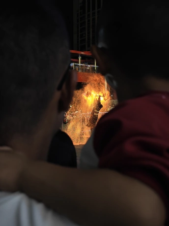 男孩好像是第一次观看火壶演出,认真观看表演的同时也紧张的抓紧父亲。