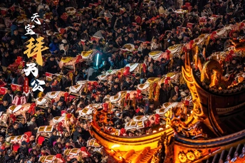 福建漳州天宝镇的拜天公仪式,画面中人群密密麻麻,纷纷抬着装饰华丽的金猪,呈现了当地民众对传统民俗文化的虔诚和热情。金色的装饰与红色的细节交相辉映,营造出浓厚的节日氛围。