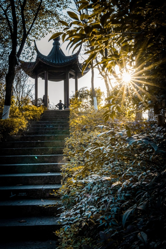 这幅摄影作品展现了一处林间古亭的景致。画面构图巧妙,利用前景的植物和台阶引导视线至中景的古亭,营造出纵深感。阳光从树叶间隙穿透,形成耀眼的光晕和星芒效果,增添了画面的层次感与氛围感,光影对比强烈,暗部细节与亮部的暖色调相互映衬,凸显了静谧而温暖的氛围。人物在亭中的身影以剪影形式呈现,为画面增添了故事性和人文气息 ,整体给人一种宁静、悠远的美感。