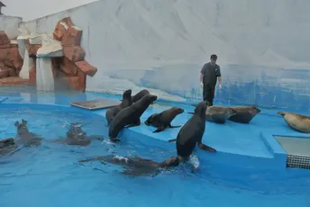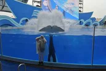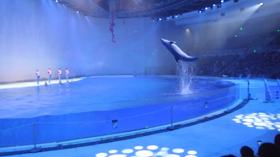 海昌公园的虎鲸表演很精彩,坐在湿身区撑着伞穿着雨披没想到虎鲸的力量这么大把雨伞都打坏了,白鲸表演也值得一看。