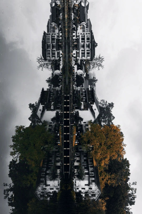这幅摄影作品呈现了江南风格的建筑群,画面采用竖构图且上下颠倒,营造出独特的视觉效果。灰白主色调的建筑与色彩丰富的树木形成对比,阴沉的天空增添了一丝静谧与沧桑感。倒影般的画面处理,给人一种虚实相生的意境,体现出江南水乡的韵味,同时也展现了摄影师独特的视角和对画面形式感的追求 。