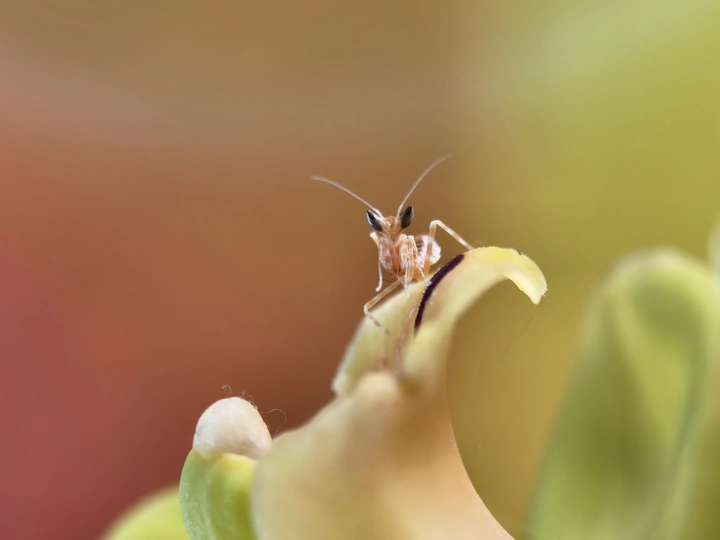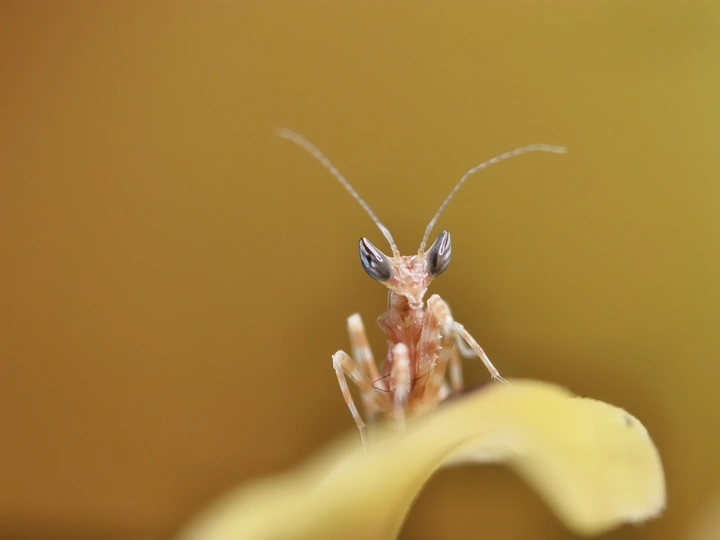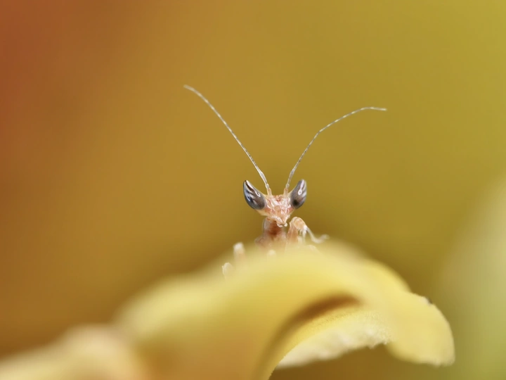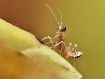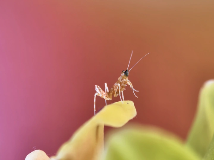 今天我有幸目睹了刚蜕皮的螳螂幼崽,微小如蚁,娇嫩的让我不忍心去触碰,看上去身体还没有变色,我非常小心翼翼的拍了下来,恐怕把它弄坏。