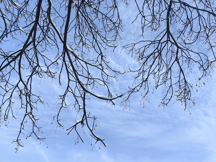 画面中,覆雪的树枝在湛蓝天空的映衬下,展现出一种冬日特有的静谧与清朗。树枝的线条简洁而有力,仿佛是大自然勾勒出的优美笔触,给人带来宁静而美好的视觉享受 。
