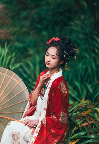 着一袭汉服,持一柄纸伞,于绿意间静处。古韵流转,似从千年画卷中款款走来,自成诗画。