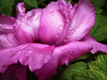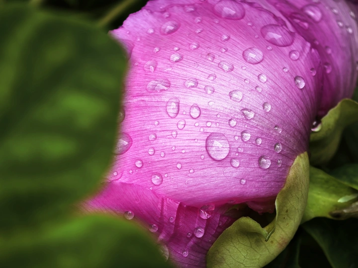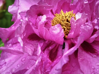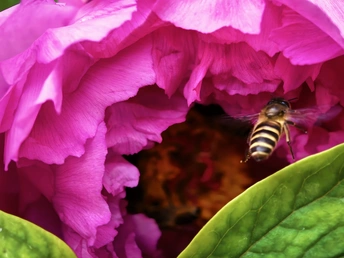 雨后的牡丹,花瓣如梦幻的粉霞,颗颗水珠似晶莹玉珠点缀其上。蜜蜂寻香而来,在硕大的花朵间飞舞,每一处细节都诉说着自然的生机与柔美 。