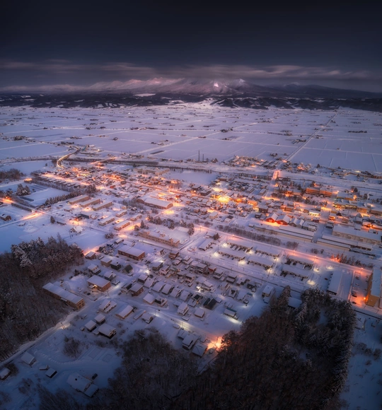 夜幕低垂,暮色如纱,中富良野的雪原在蓝调时刻下,宛如童话世界。远处的山峦被薄雾轻笼,若隐若现,宛如大地沉睡的守护者。小镇的房屋错落有致,暖黄色的灯火从窗户透出,在白雪的映衬下,化作点点星辰。道路蜿蜒曲折,宛如一条金色的丝带,将家家户户紧密相连。此刻,时间仿佛凝固,只剩下雪花轻舞,灯火摇曳,带来无尽的温暖与安宁。