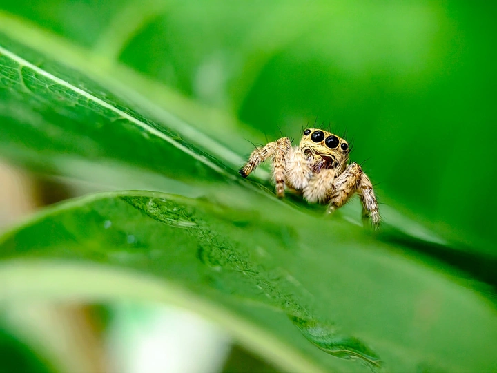 在翠绿欲滴的叶片上,这只跳蛛宛如大自然的小精灵。那圆溜溜的大眼睛透着好奇,浑身绒毛好似藏着无数秘密,静静蛰伏,却仿佛与周遭的绿意融为一体,诉说着微观世界的奇妙与生机。